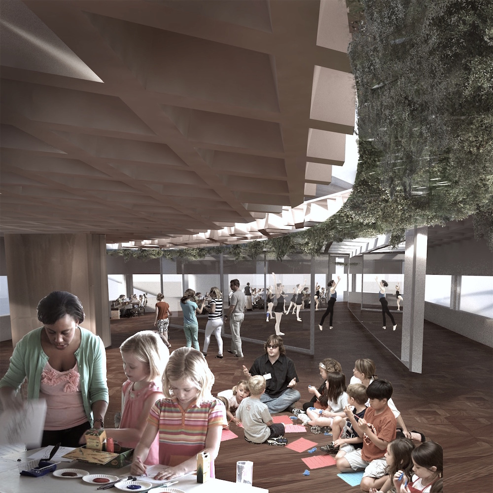 Interior Render of childrens workshop, dance studio, restaurant and pathway with spanish moss and daylight above it Posted on April 17, 2018